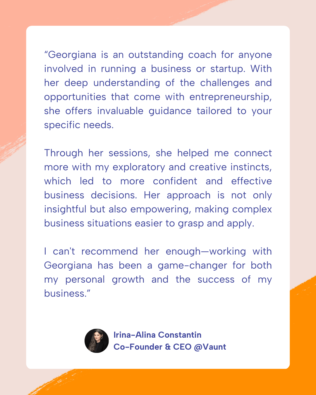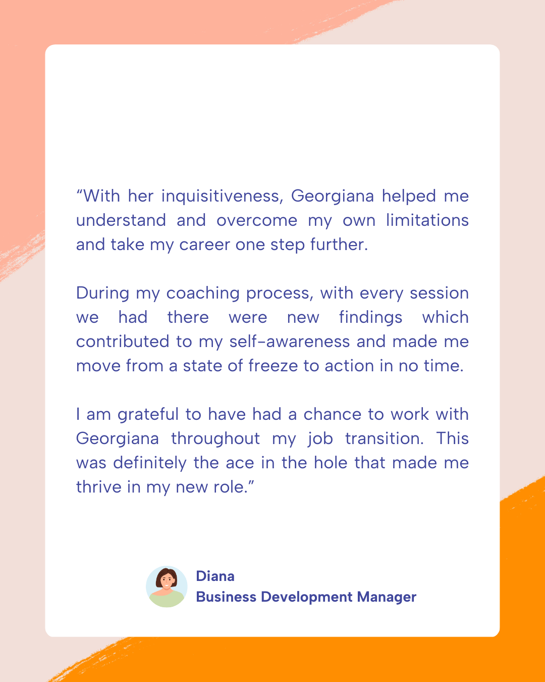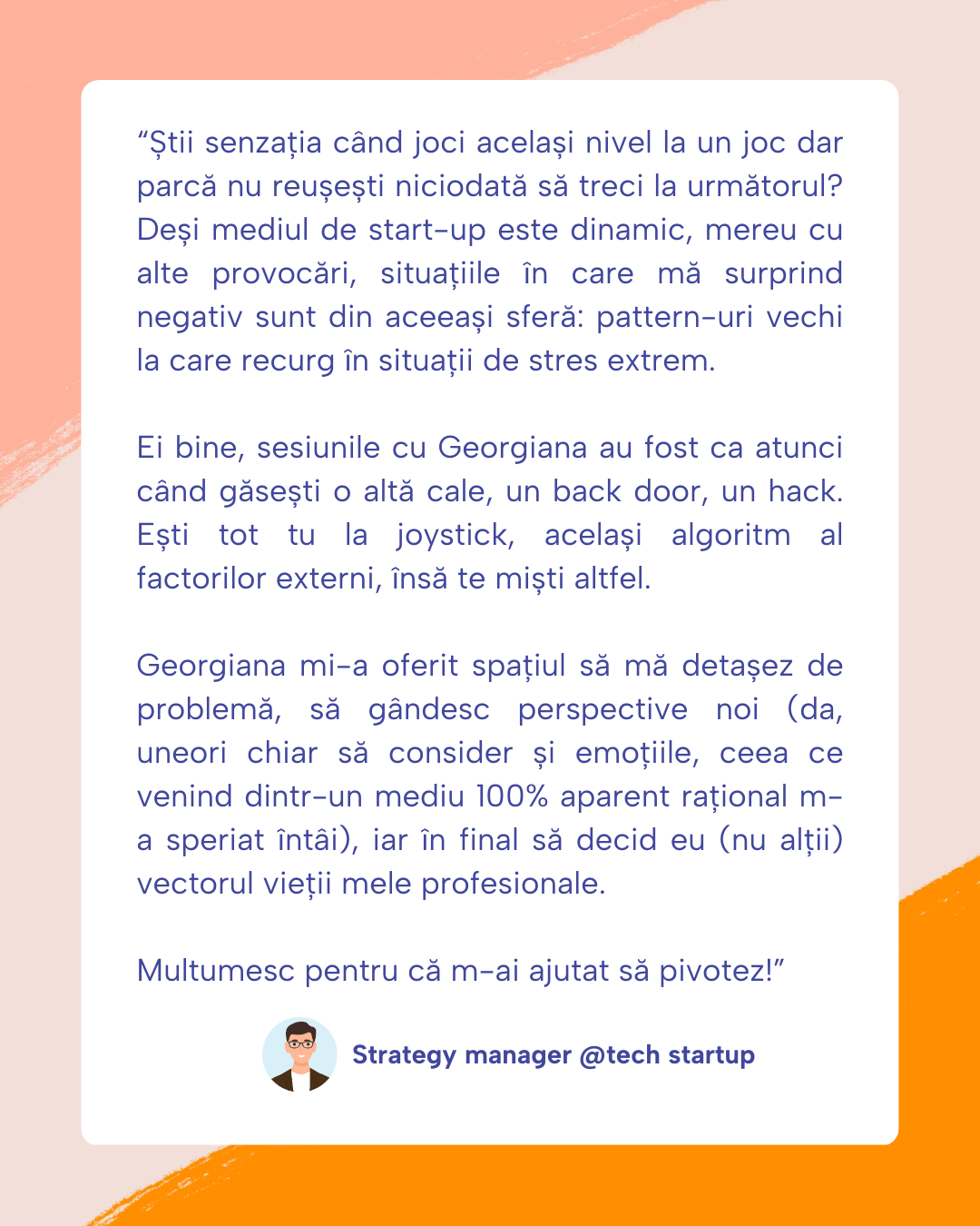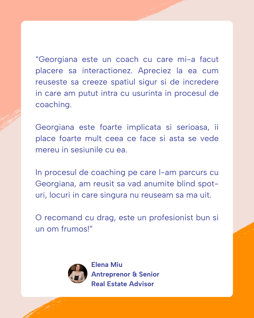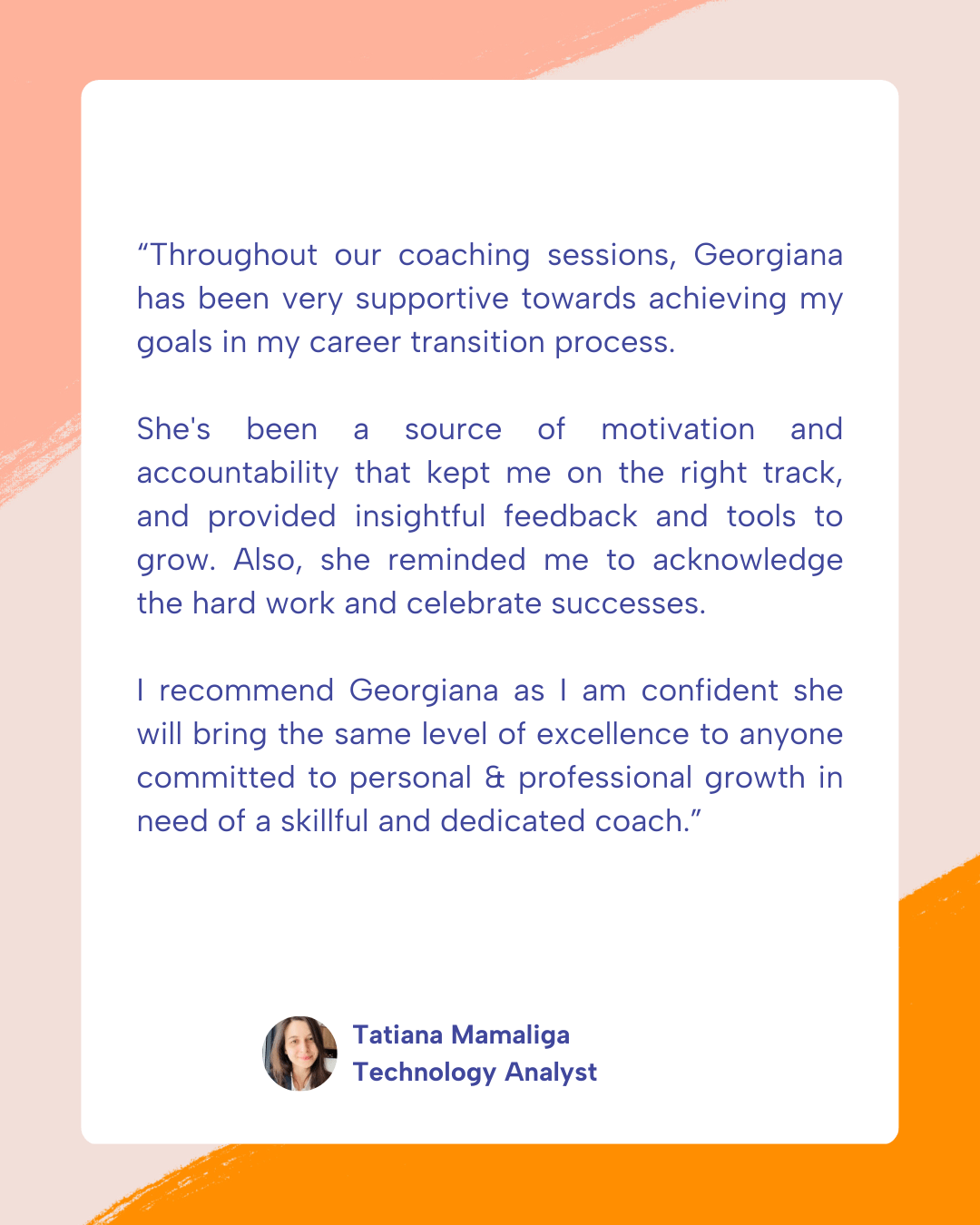 Salut! Sunt Georgiana, antrenor de creștere personală / coach. Lucrez cu tech professionals pentru a-i ajuta să crească în sync cu cariera lor.