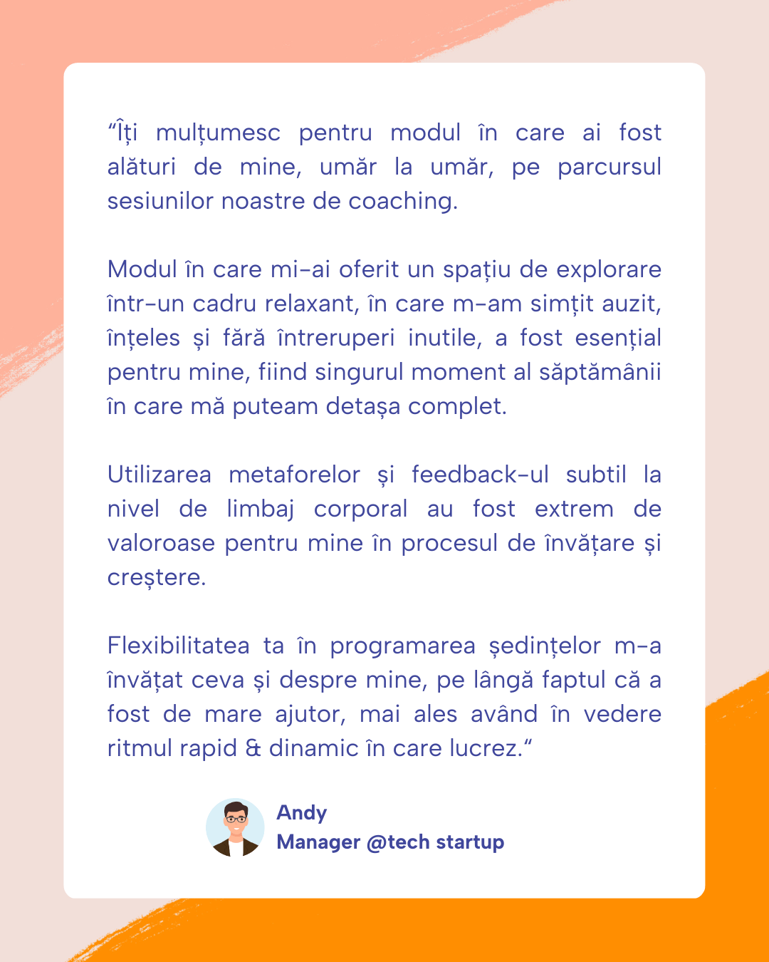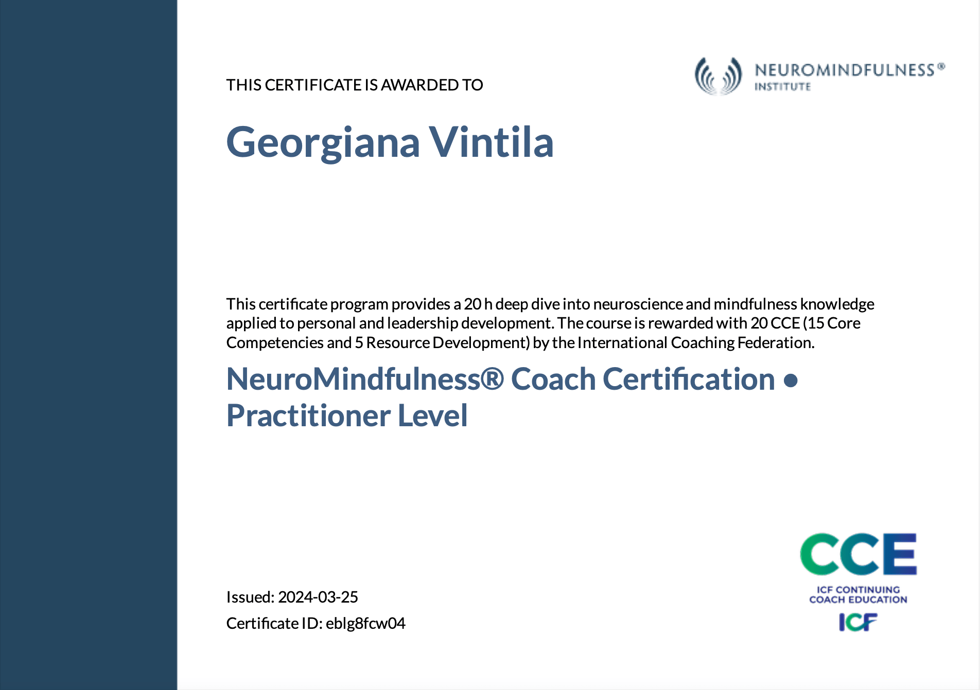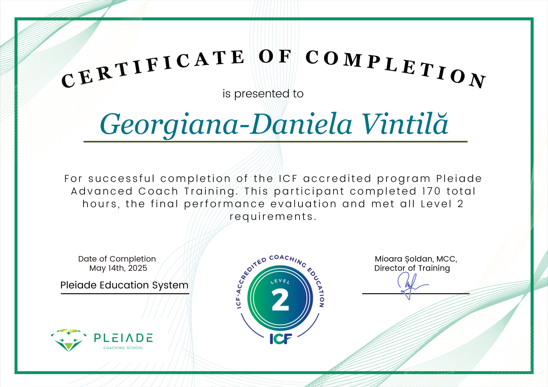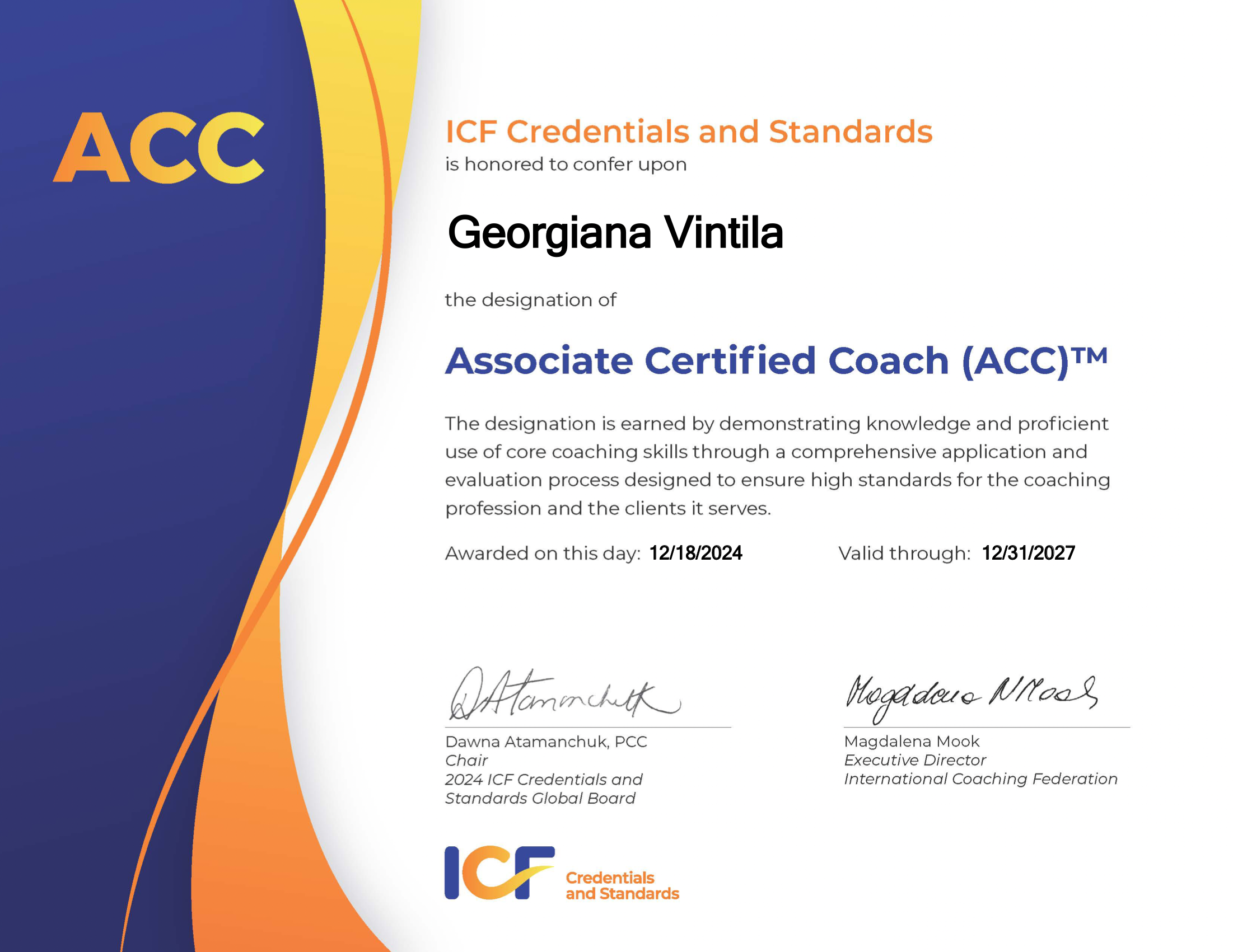 Am pus bazele meseriei de coach alături de profesioniști de top din România & străinătate; sunt certificată la nivel global de International Coaching Federation